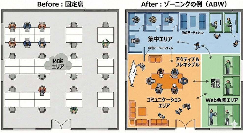 単に机を並べるのではなく、業務内容に合わせて働く場所を選ぶ「ABW(Activity Based Working)」の考え方を取り入れ、エリアを明確に分けます。